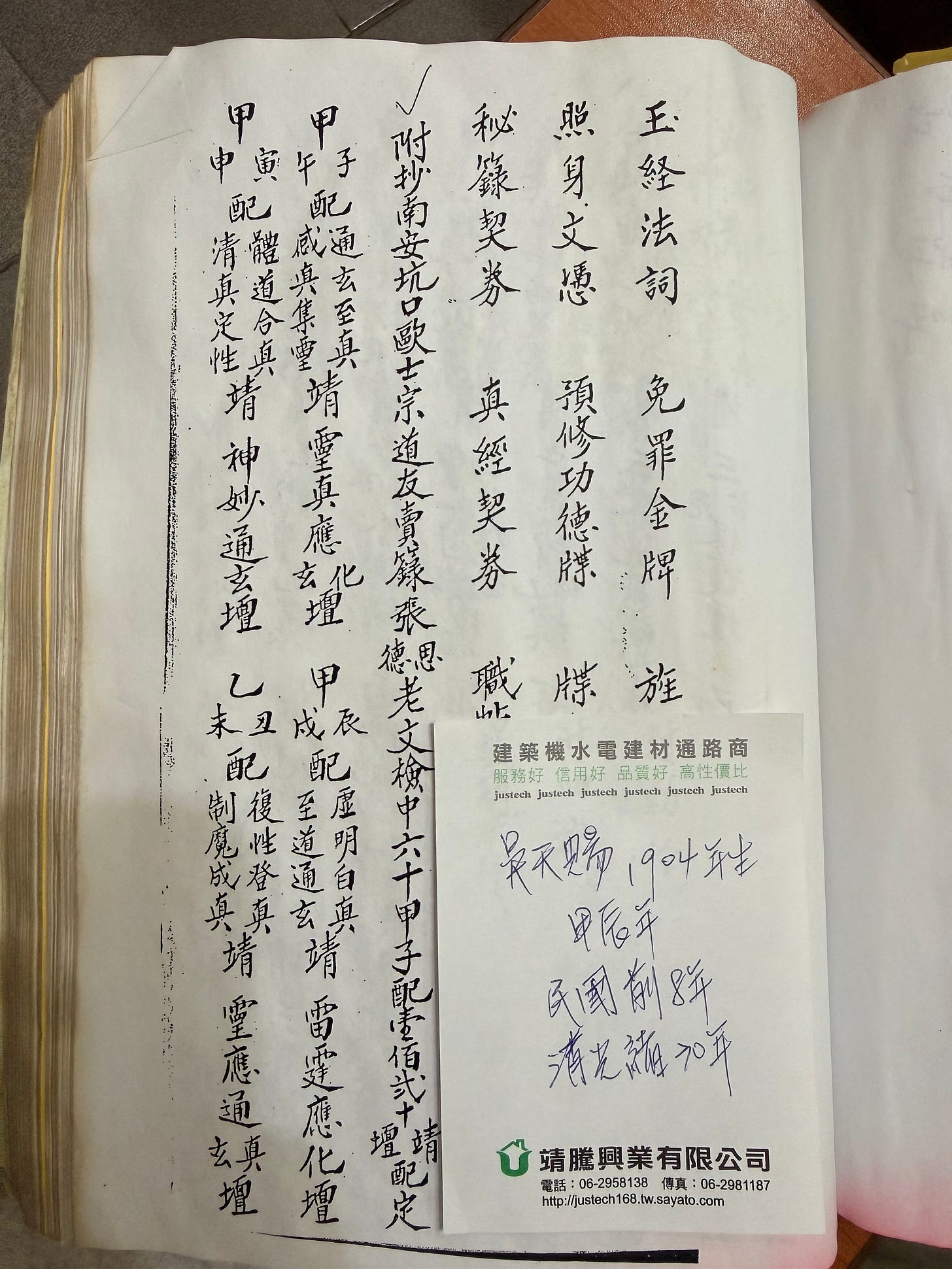 接著老師就舉了幾個例子跟我說明。在小法咒詞中有一段「虛明白真靖」,這其實是吳天賜師公自己的壇靖,壇靖會依照每個人的生辰八字不一樣,回天(過世)就要繳回去了,以老師來說,他的壇靖是「體道會真靖」,說著說著,老師開始翻閱書籍,跟我解釋不同的道書其實壇靖也會有些許差異,這些都是要去挖的。我翻著道書,看到了自己的生辰對應到的8壇靖,心中燃起更大的好奇心。